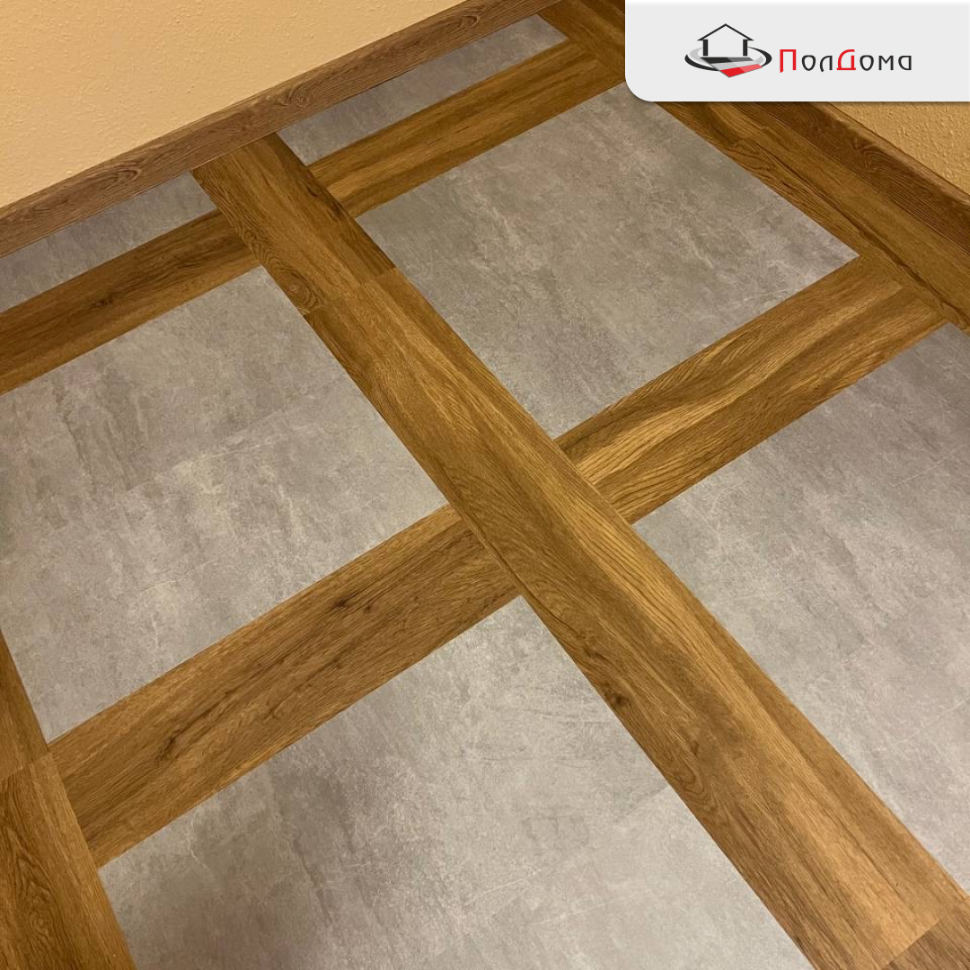 Для реализации этой дизайнерской задумки мы использовали два вида клеевой ПВХ плитки, которые великолепно сочетаются друг с другом по текстуре и цвету: